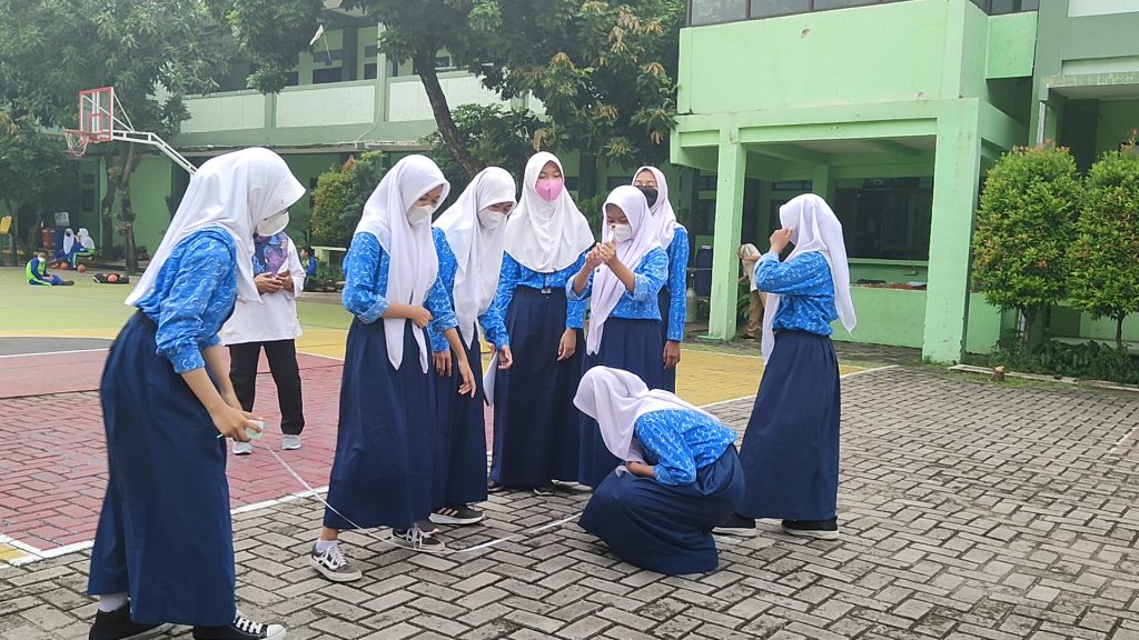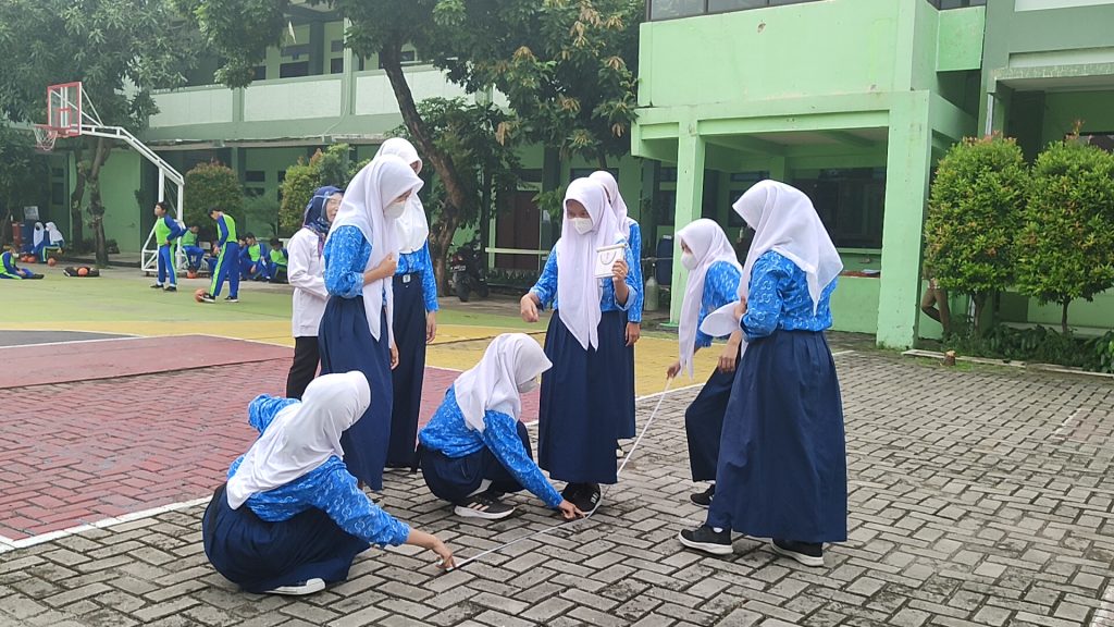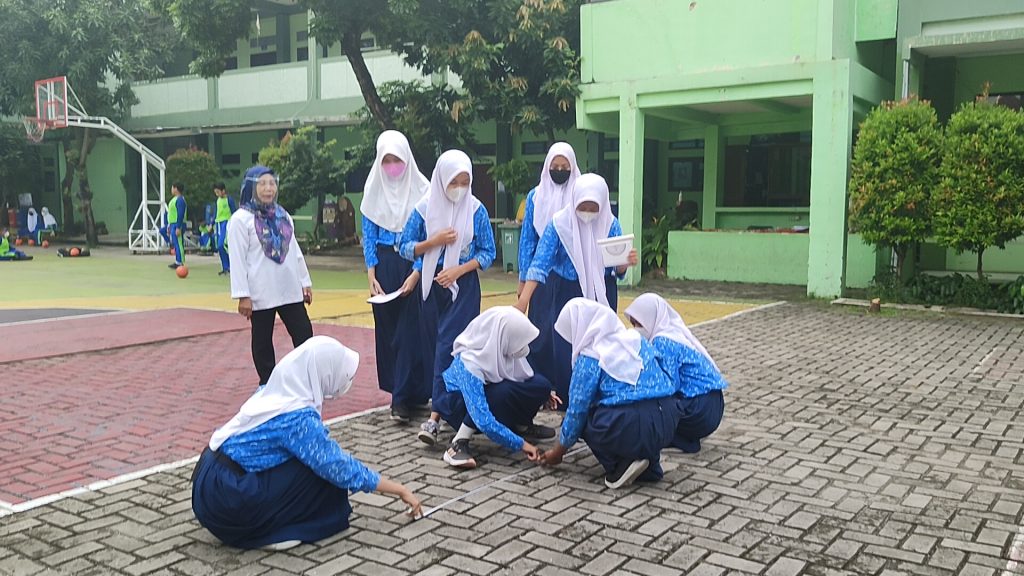Ibu Sudaryanti guru matematika sedang mengeksplore kemampuan murid dengan metode outdoor study untuk menghitung sudut. murid terlihat sangat antusias dan bahagia dalam pembelajaran.