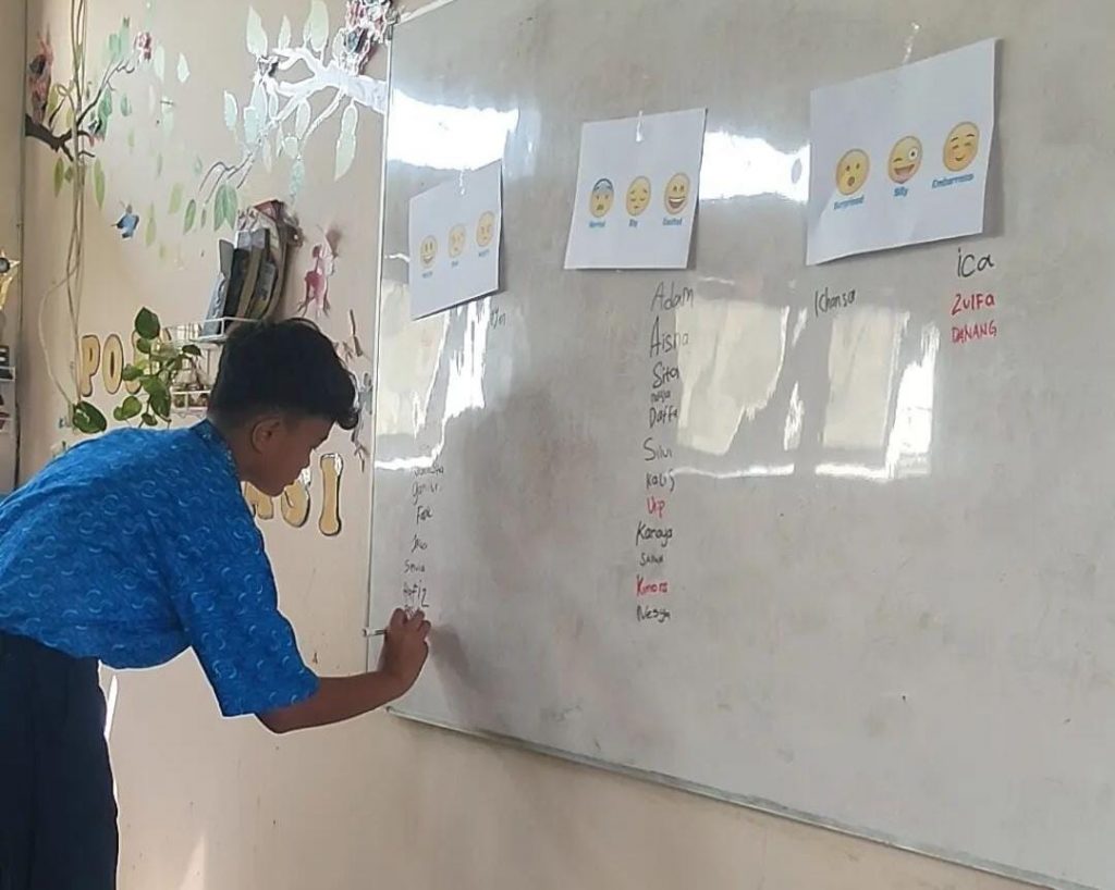 1, Mengenal emosi diri lewat emoticon indikator, siswa sebelum dan setelah belajar diminta untuk menuliskan namanya dibawah gambar emoticon yang mewakilinya.