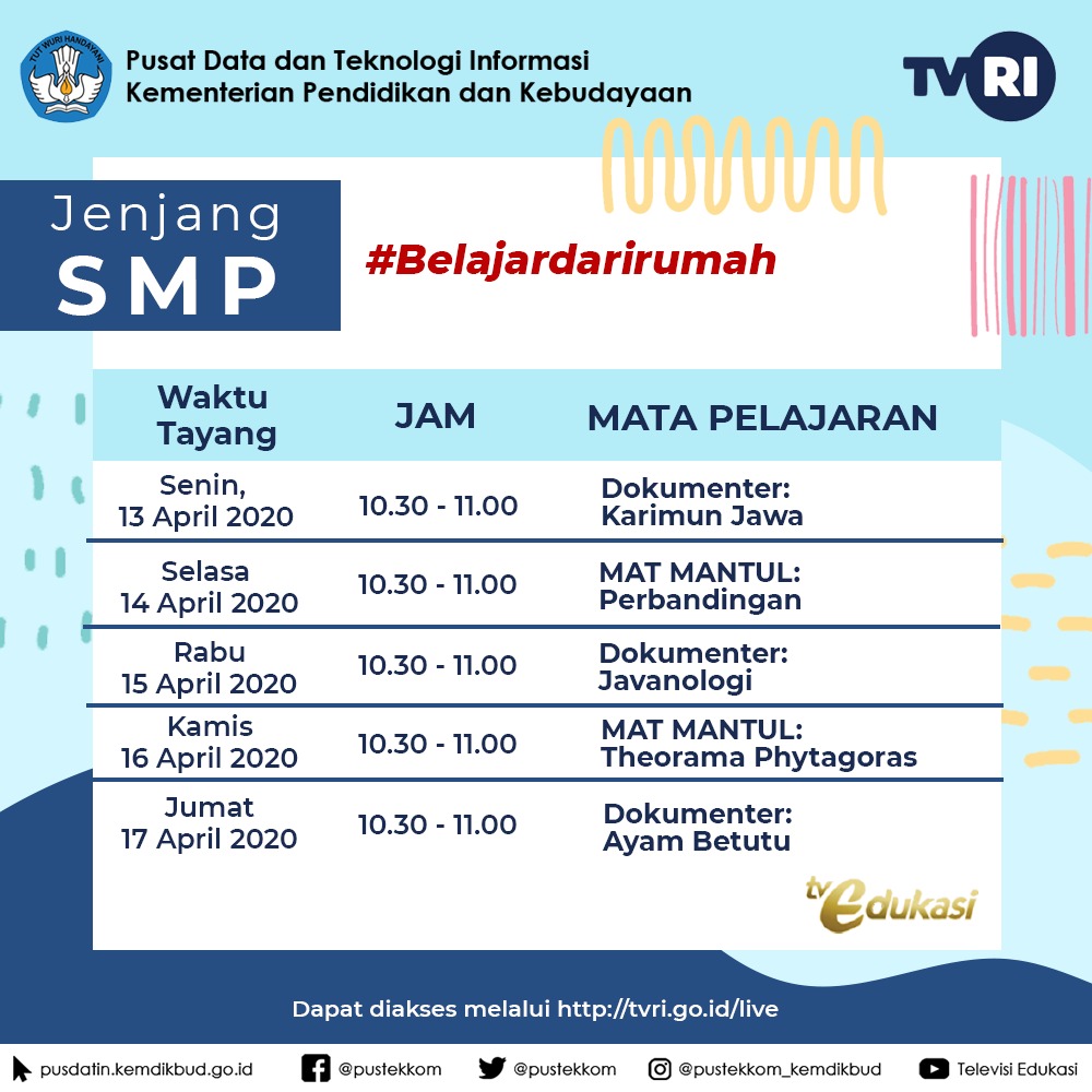 3. Sambil menunggu info perpanjangan dari Dinas Pendidikan Kota Bekasi, jadwal Pembelajaran Jarak Jauh (PJJ) hari Senin 13 April 2020 mulai BERUBAH mengikuti arahan pak Menteri Pendidikan yaitu belajar dari rumah dengan menonton saluran TV TVRI, atau bisa diakses di TV online dengan alamat : http://tvri.go.id/live dengan jadwal sbb :