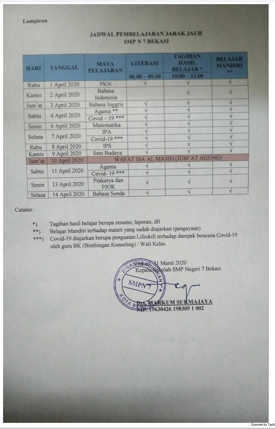 PENGUMUMAN Posted on March 31, 2020 by admin 0 PENGUMUMAN KEGIATAN PEMBELAJARAN JARAK JAUH DALAM MASA PENCEHAHAN PENYEBARAN COVID-19 DI SMP NEGERI 7 DAN USB 51 BEKASI Demikian, harap di baca dengan seksama, jika ada pertanyaan, silahkan komen di kolom komentar. Terimakasih.