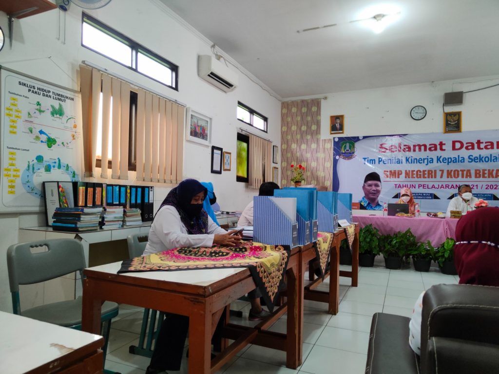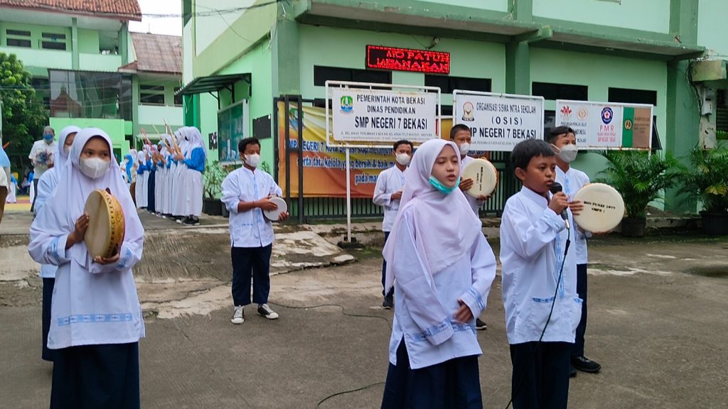 Kegiatan berkolaborasi dengan tim, guru dan siswa. kedatangan tim penilai disambut oleh Hadroh SMPN 7 Bekasi, kemudian asesor diberi sarung dan bouqet kerudung. acara selanjutnya pembukaan, sambutan dan penayangan profil kepala sekolah.